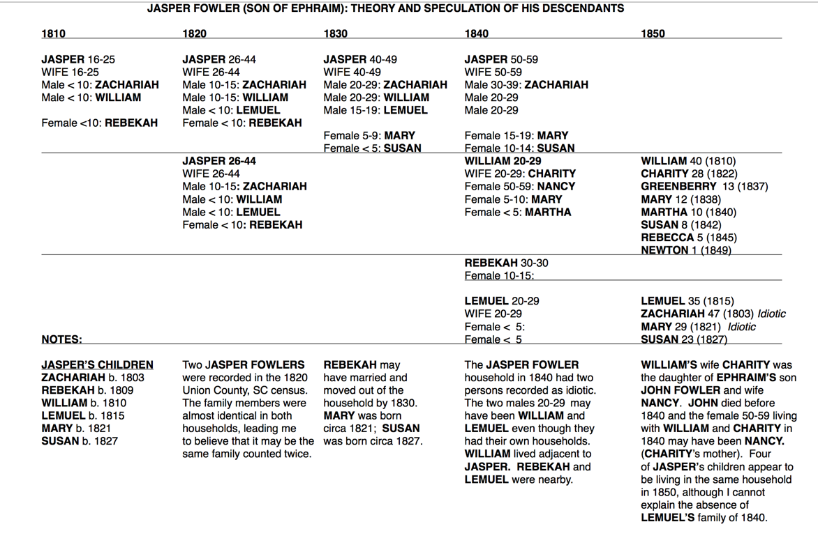 To confuse us, there are two Jasper Fowlers in the 1820 Union County, SC census. The households are almost identical and I do not know if the household was recorded twice or if there were two Jasper Fowlers in Union County that year. If there were two, one of them disappeared by 1830, never to be seen again.