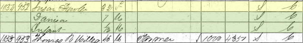 In 1860, Susan Fowler headed a household that contained her seven year old son Danison Fowler and a male infant one month old. The family was enumerated on July 23, 1860. Note that the next door neighbor was a man named Thomas R. Miller.