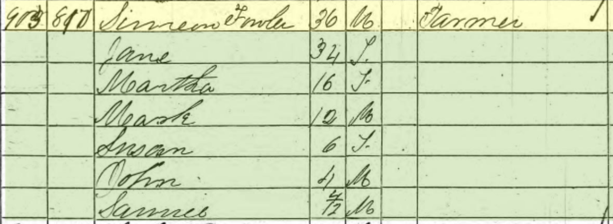 1860 Union County, SC Census: Ellis Fowler, son of Mark, may have died after 1850 and before 1860. In the 1860 census, his widow, Jane Hodge Fowler, had married Simeon Fowler (son of William and Rhoda Moseley Fowler; William may have been the son of John Fowler “the Elder” and Fannie). In addition to Martha and Mark, the children of Ellis and Jane, there were 3 more children in the household: Susan (b.1854), John (b. 1856), and Samuel (b. 1860).