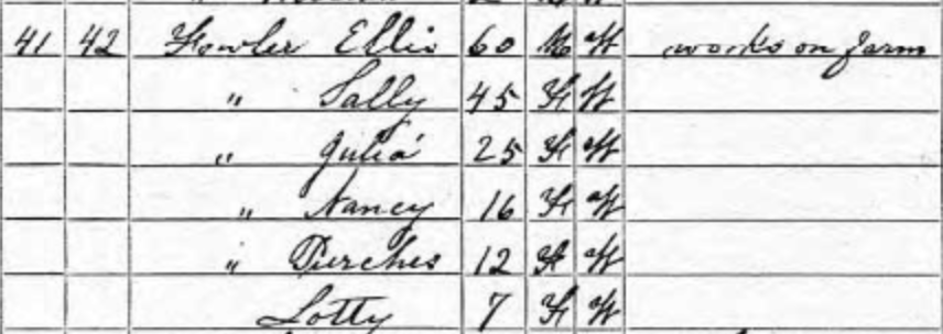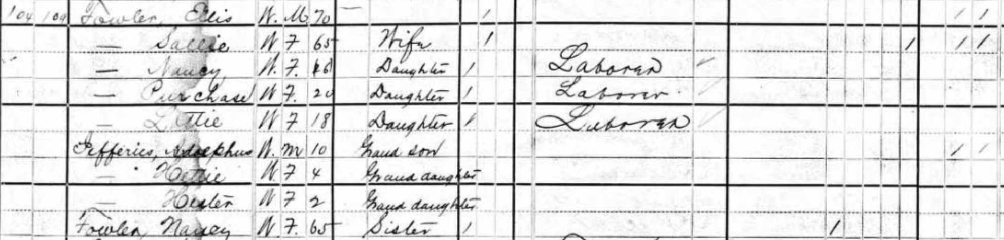 1880 Union County Census: Ellis and wife Sally had not added any more children to their family, although their household now included Nancy Fowler, sister of Ellis, as well as 3 Jefferies grandchildren, Adolphus, Hettie, and Hester.
