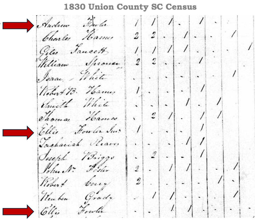 Andrew Fowler was recorded in the 1830 Union County, SC census as (20-29 years) of age, along with a female (wife Nancy Hames?), three males ages (10-14). (5-9), and (< 5,) and a female (< 5.)