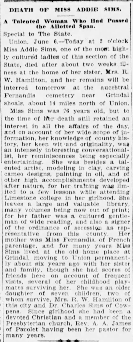 Addie Sims died on June 6, 1905 at the home of her sister, Mrs. Hamilton. She was buried in the Sims/Fernandez cemetery near the Pacolet River.