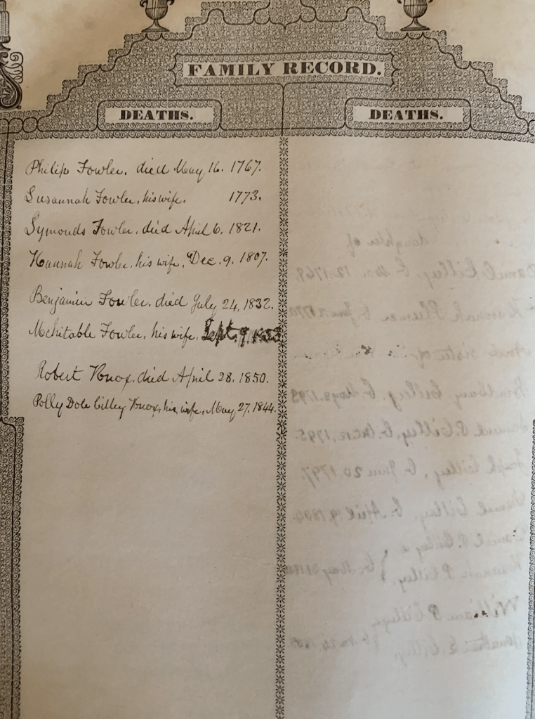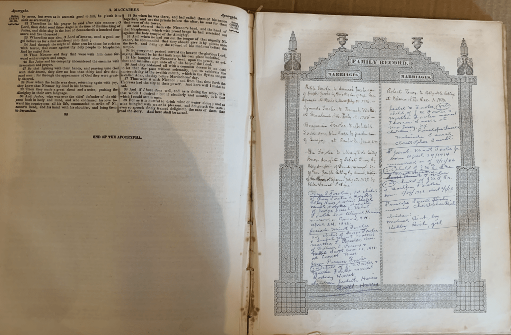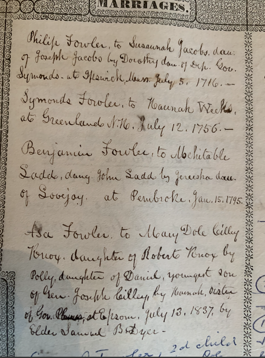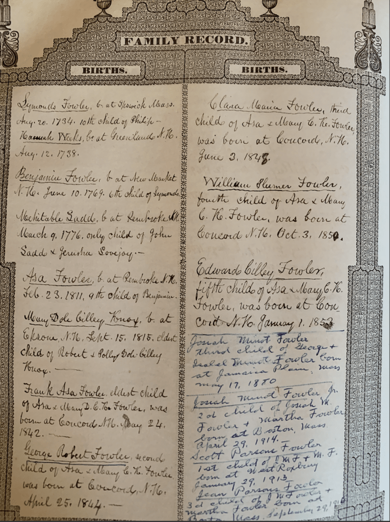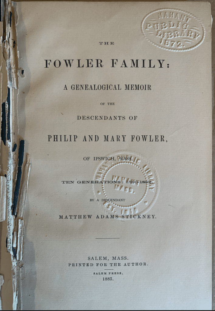 The Family Bible is a treasure, but I was also fortunate enough to obtain a first edition family history of Philip Fowler and his descendants: The Fowler Family- A Genealogical Memoir of the Descendants of Philip and Mary Fowler of Ipswich, Massachusetts by Matthew Adams Stickney; published 1883.