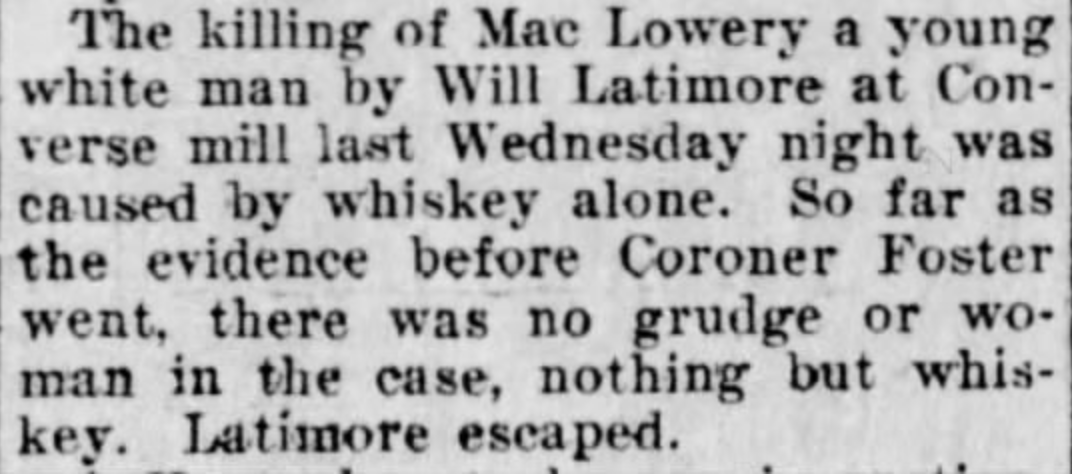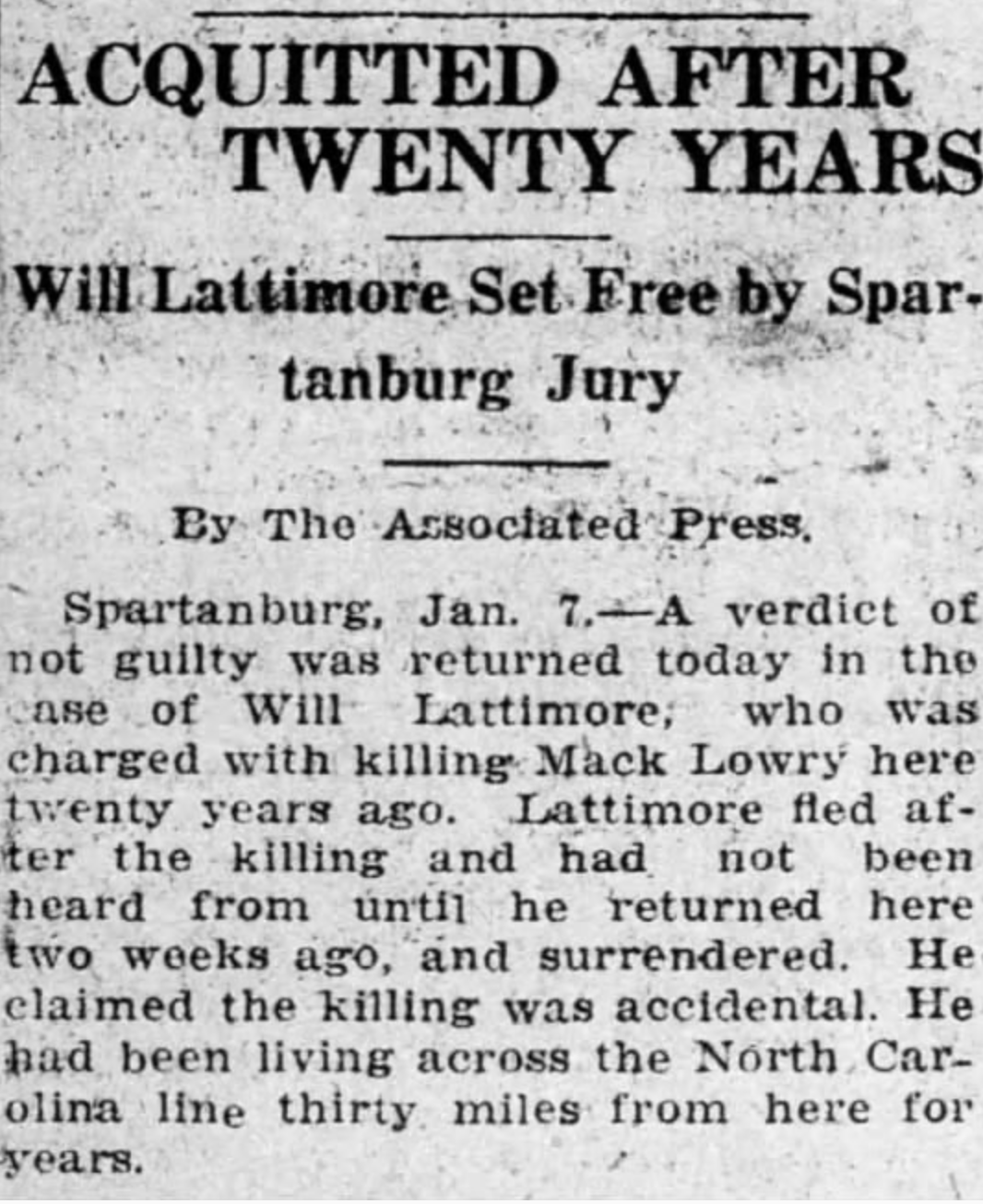 Mac Lowery was just missing. But, he made a final appearance on November 27, 1901, when he was shot and killed by William Lattimore near Spartanburg, SC. He left a daughter, my great grandmother Ida Letha Lowery an orphan who would live with her Lowery grandparents until her eventual marriage to Adam Teseniar.