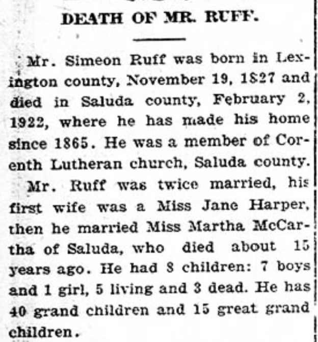 Simeon Godfrey Jacob Roof died Feb 2, 1922. He and Martha Matilda are buried at Salem Baptist Church Cemetery in Saluda County, SC. The Roof name was interchangeable in life and in death. His headstone reads Simeon G. J. ROOF; hers, Martha Matilda RUFF.