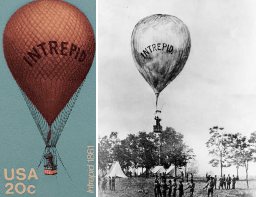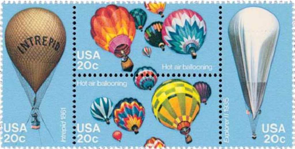 In 1983, the United States Postal Service released a set of four beautiful hot air balloon stamps to celebrate the 200th anniversary of the first hot air balloon flight. The balloon on the left named The Intrepid was owned and used to spy on Confederate forces in the Civil War by Professor Thaddeus Sobieski Constance Lowe (1832-1913).
