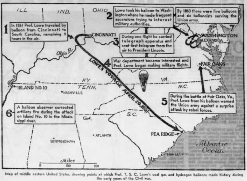Professor Thaddeus Lowe was an aviation expert, Army spy, inventor, scientist, owner of a railroad, father of ten children. He became very wealthy and built a 24,000 square foot home in Pasadena, California. He lived a long life of eighty years. His accomplishments were many and great. His life is worth an internet search; there has been much written about him.