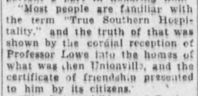 Professor Lowe never felt any cordial reception. I am sure he felt fear and regret– deep regret that he had ever landed in such a place. I am especially sure that the words “True Southern Hospitality” never crossed his educated mind.