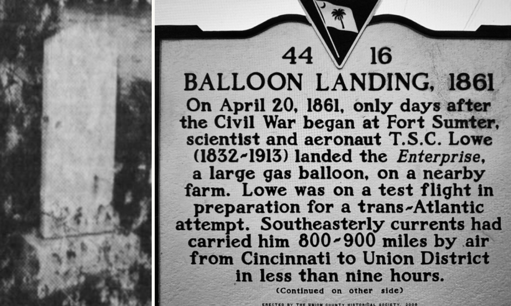 The photograph above was taken seventy years after the Balloon Landing, on April 20, 1931, when a monument was placed on the site to commemorate the momentous occasion. Sarah Frances “Fannie” Bevis Holcomb (1842-1936) and Melissa Swann Aycock (1944-1937) were present the day Thaddeus Lowe landed in Union County in 1861 and also present the day in 1931 that the monument was put into place.