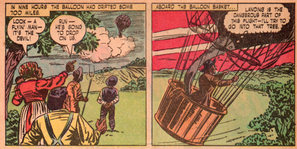 While many of the men cowered behind bushes, two brave women, Theresa Hames and Susie Palmer, took hold of the rope that Professor Lowe dropped to the earth, and pulled him out of the sky.