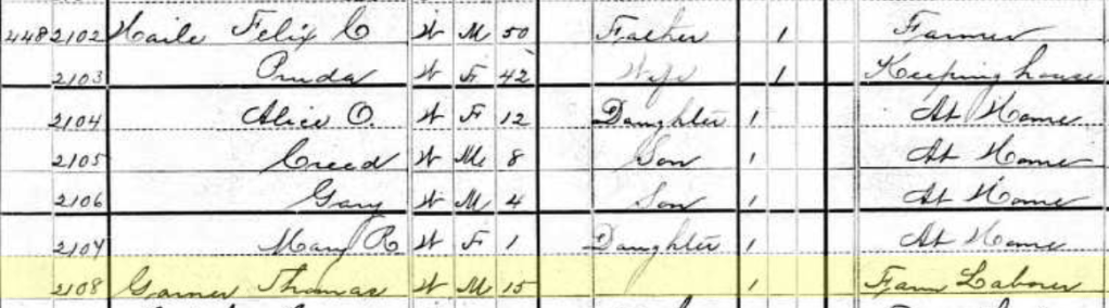 Fifteen year-old Thomas Samuel Garner was in the 1880 Jonesville household with his mother Pruda Bolt Garner Haile, his stepfather Felix Haile, and his half-siblings.
