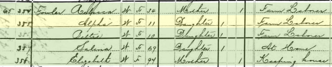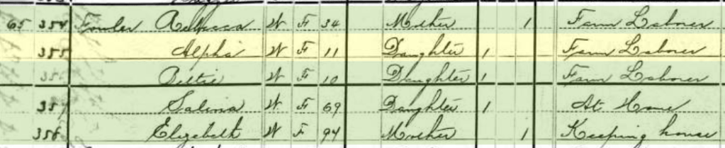 In 1880, Alpha Fowler was eleven years old and lived in an all female household — her mother Rebecca, grandmother Elizabeth, sister Bettie, and aunt Salina — in Jonesville.