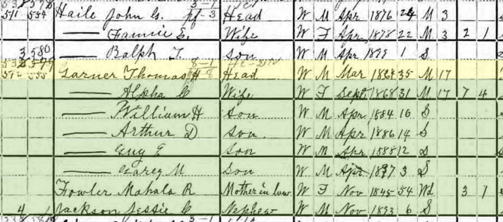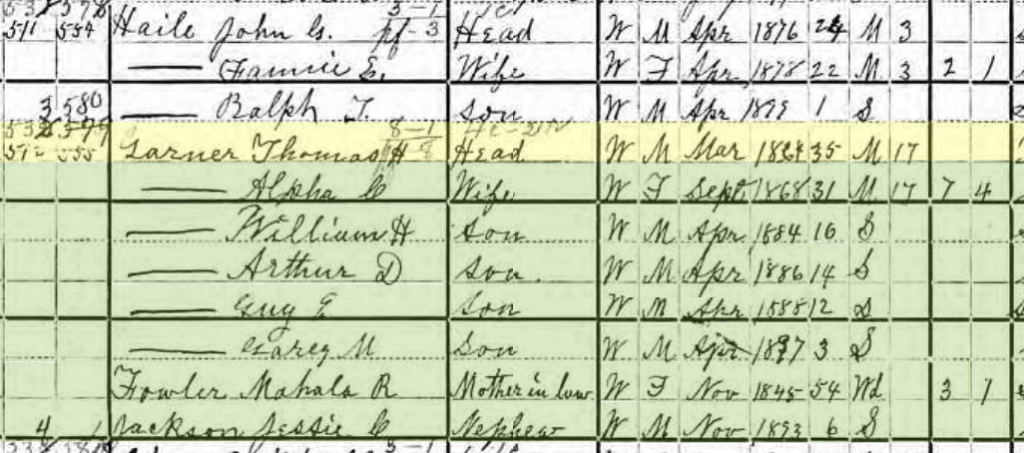 The Thomas Samuel Garner family was in South Carolina until 1897. By 1900, the family had moved to Fulton County, Georgia. The family next door to them in 1900 was Thomas Garner’s younger, half brother, John Gary Haile (1876–1922), son of Felix Haile and Pruda Bolt.