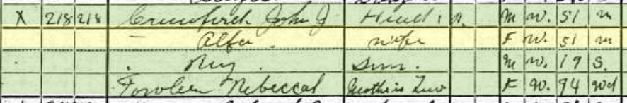 Alpha Ethel Fowler Garner married John Joab Crawford (1868–1954) before 1920. It was a second marriage for both. They were recorded together in a Georgia Census in a household that contained Alpha’s 19 year-old son Roy Garner, and her elderly mother Mahala Rebecca Worthy Fowler.