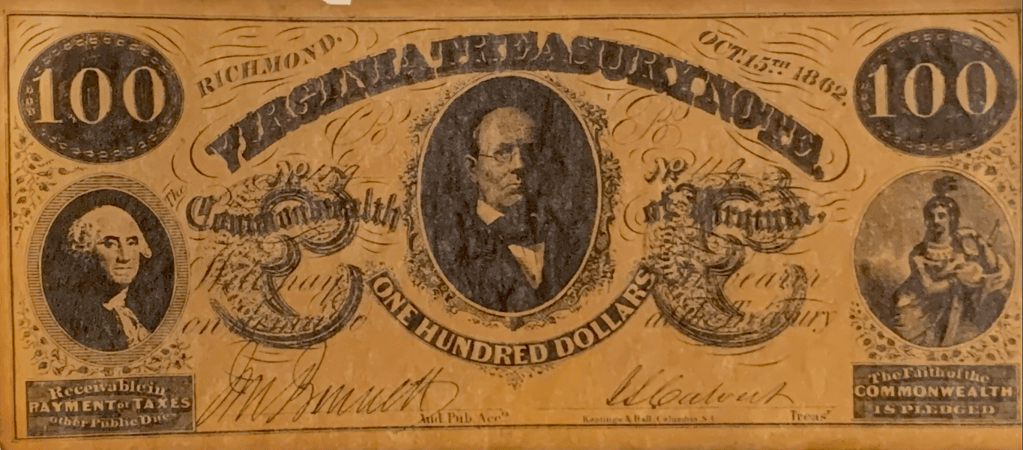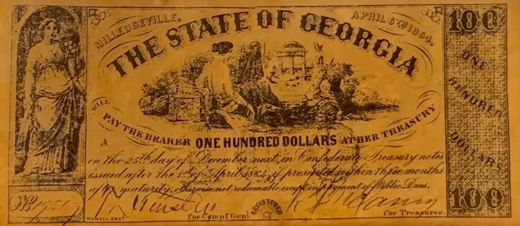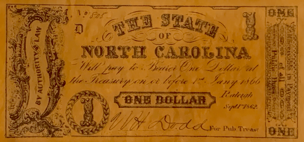 In 1864, the year before the war ended, a Confederate dollar was worth only 3 cents, and by the war’s end in 1865, it was worthless.