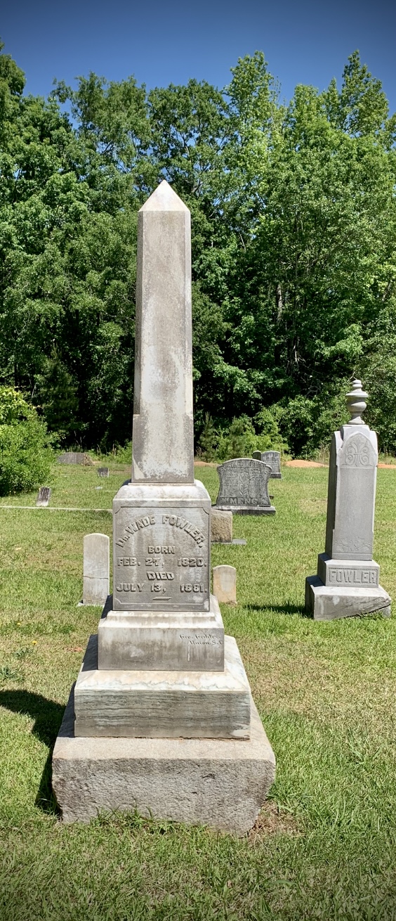 John C. Fowler (1851-1884) lies between the graves of his father, Dr. Wade Fowler, and his sister, Sallie R. Fowler. His headstone is identical and was made by the same stone mason.