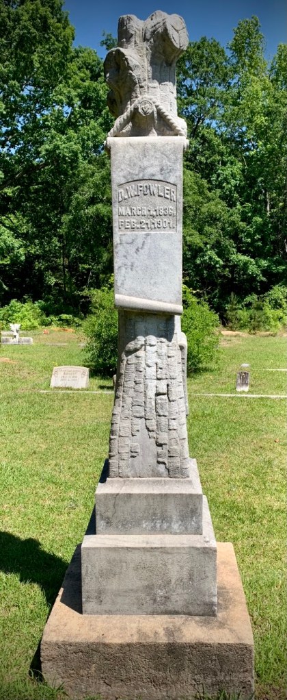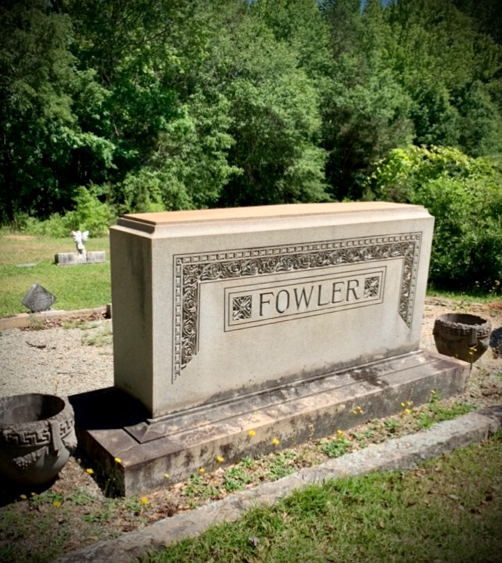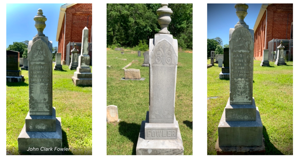 The graves of John Clark Fowler and his wife Mary Henley Fowler are only a stone’s throw from the graves of Dr. Wade Fowler, Sallie Fowler, and John C. Fowler. The headstones of the latter are tall and stately, but yet unlike those of the former.