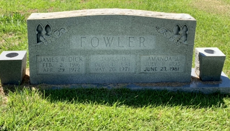 James David Fowler and his wife Amanda Jones share a headstone with their son, James William “Dick” Fowler (1916 -1972).