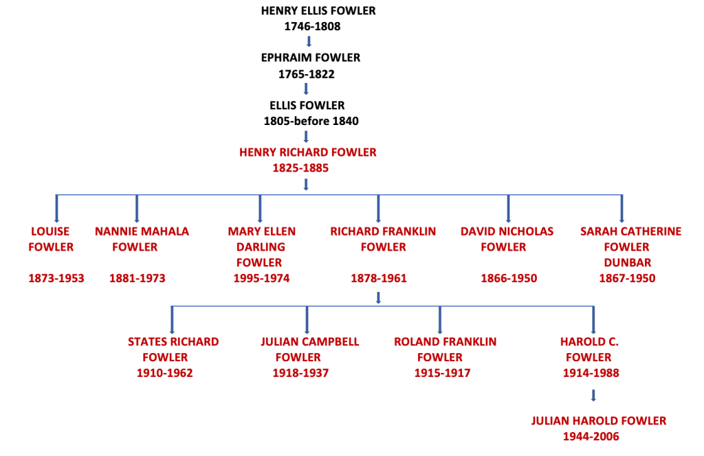 Daniel Wallace Fowler (18 – 19) was the son of William G. Fowler, son of Israel Fowler II, son of Israel Fowler I. The earliest known ancestors of this Fowler line were found in Isle of Wight, Virginia.