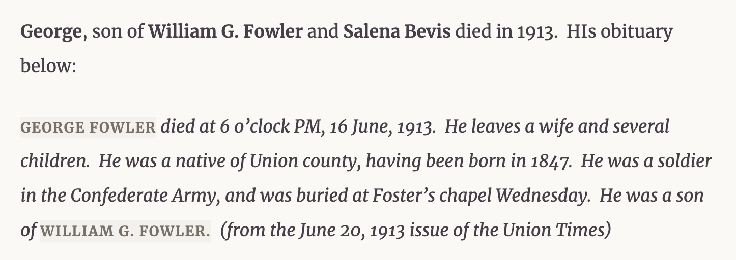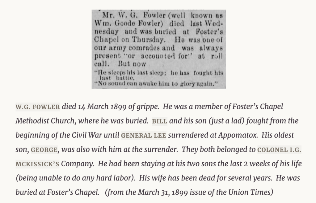 William Goode Fowler (1825-1899) and his son George W. Fowler (1847-1913) are buried at Foster’s Chapel Cemetery. There are no engraved headstones for father or son, and there is little evidence of where they were laid to rest other than their obituaries in the local paper at the time of their deaths.