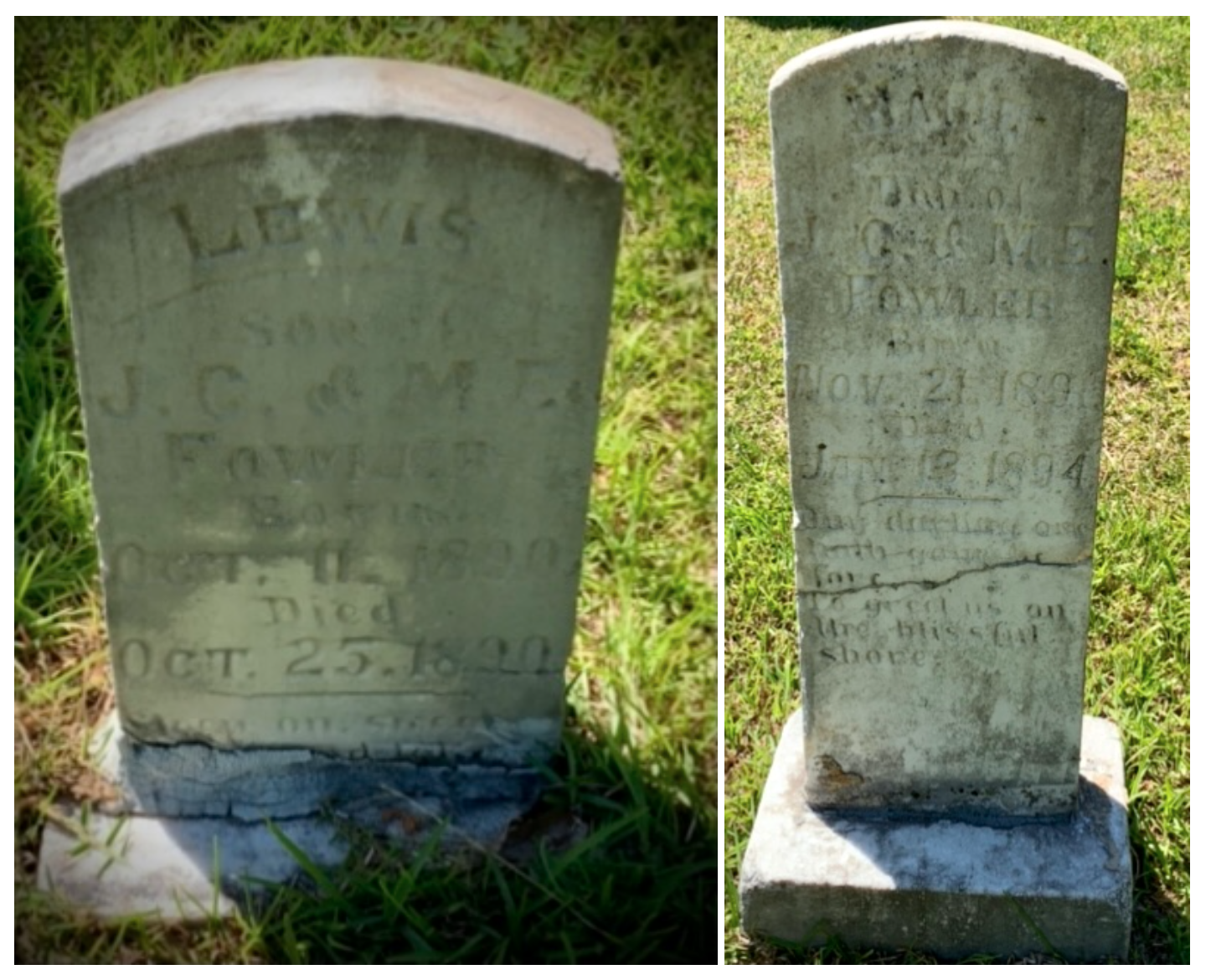 Lewis, son of John Clark Fowler was born and died in October 1890. Daughter Marie was born in 1891 and died in 1894. The headstones of the two children are near the graves of their father and mother.