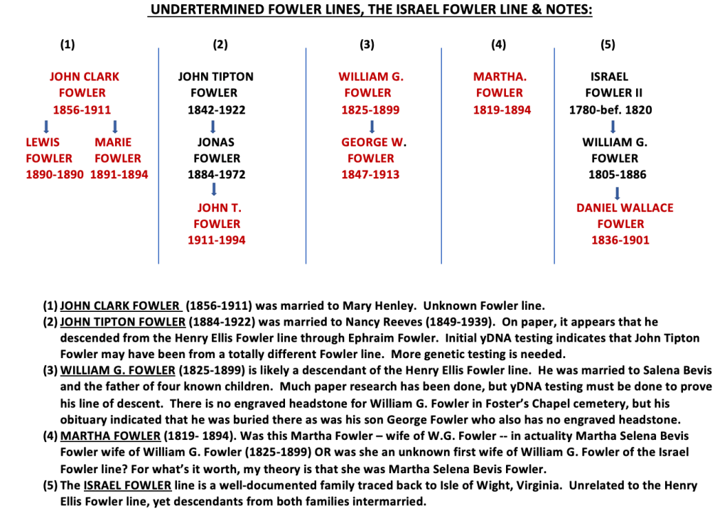Fowler, son of John Fowler, son of Ephraim Fowler, but there is no documented proof of this. Paper research seems to support this line of descent, but the very limited yDNA evidence has been questionable. More directly descended men from this line are needed for testing in order to prove this Fowler line.