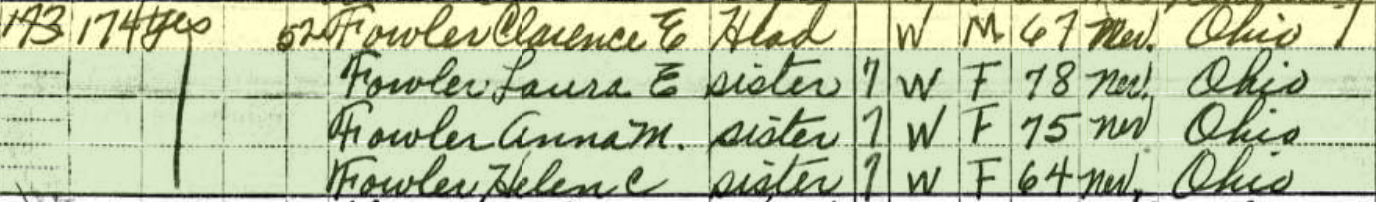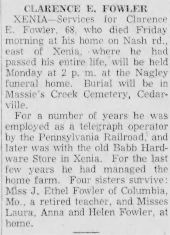 Clarence Fowler, like his eldest brother, worked for the Railroad. Unlike his brother, Clarence spent his entire life in Greene County, Ohio and never married.