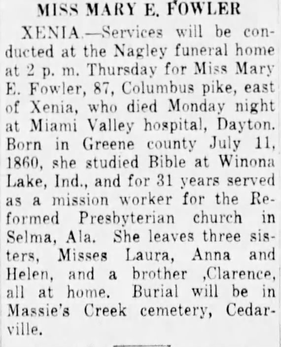 Below are Mary Elizabeth Fowler’s obituary and a photograph of the Selma Reformed Presbyterian Church.