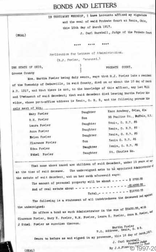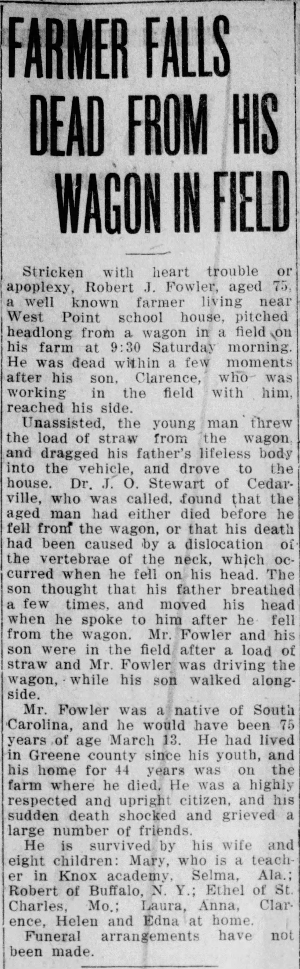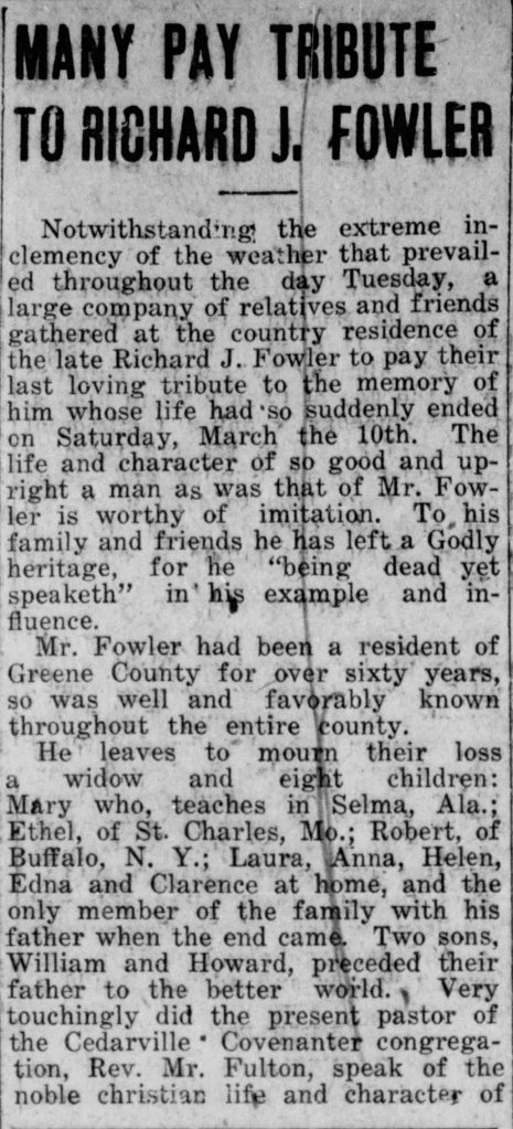 On March 10, 1917, Richard Fowler rode on his wagon in his fields, while his son Clarence walked nearby. Both men were working on the farm when Richard fell from the wagon dead. Obviously in haste to include news of the death in the current edition, the newspaper mistakenly printed his name as Robert J. Fowler.