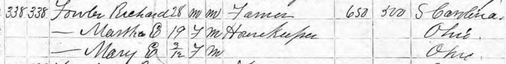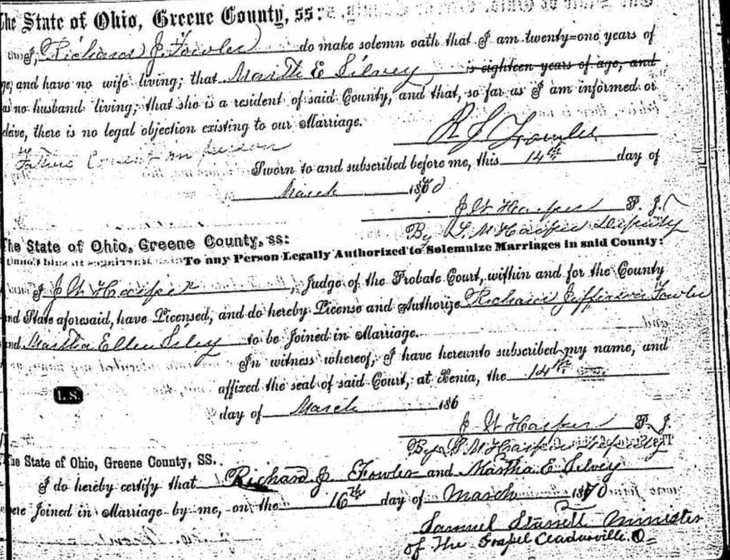 The Richard Fowler family –husband, wife, and daughter Mary — were counted in the Greene County, Ohio census in 1870.
