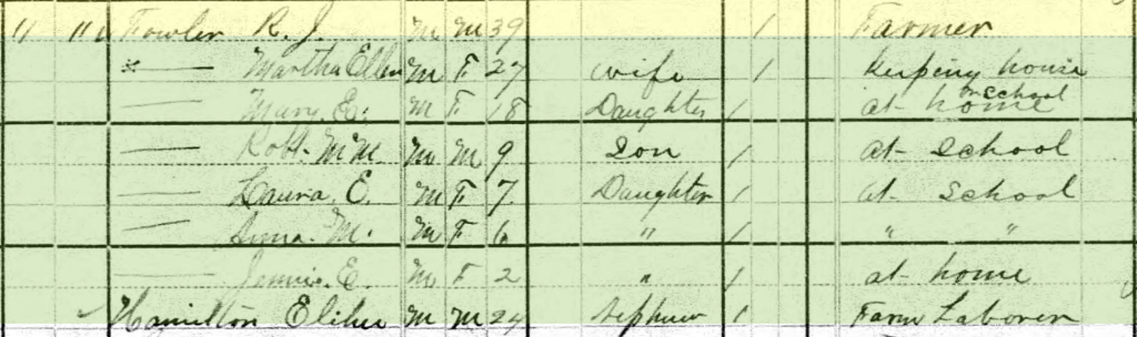 More children had been born to Richard Fowler and wife Martha by 1880. Elihu Hamilton, a Chester, South Carolina born nephew of Richard Fowler lived with the family.