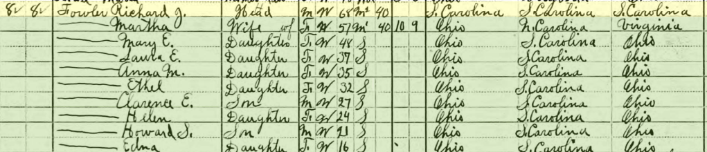 He seemed like a fairly good fit. Richard Fowler was born to Andrew Fowler and wife Mary Scisson in or about 1845. Richard Fowler was in the 1850 and 1860 census records with his family. Then a Richard Fowler born in South Carolina ca. 1842 was in Ohio by 1863, and his appearance in the 1870, 1880, 1900, and 1910 Ohio census records seemed to be a continuous documentation of this son of Andrew.