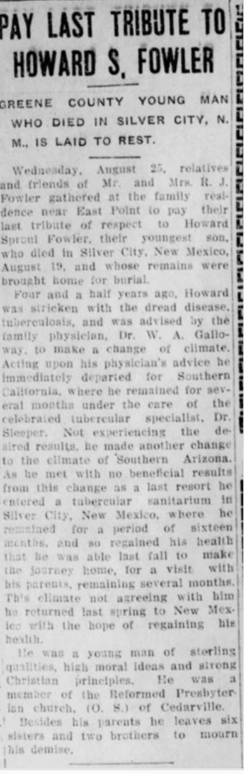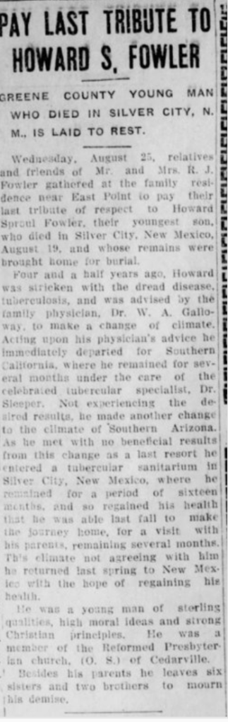 Howard Fowler was the youngest son of Richard J. Fowler. Four and a half years before his death in 1915, he became ill with tuberculosis. Upon the advice of his doctor, he moved to the dryer climates of the American Southwest. Howard Fowler spent the last years of his life in southern California, southern Arizona, and then finally, Silver City, New Mexico where he lost the battle with the disease that affected so many of the times.