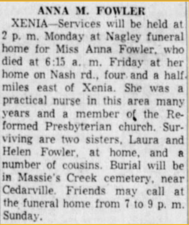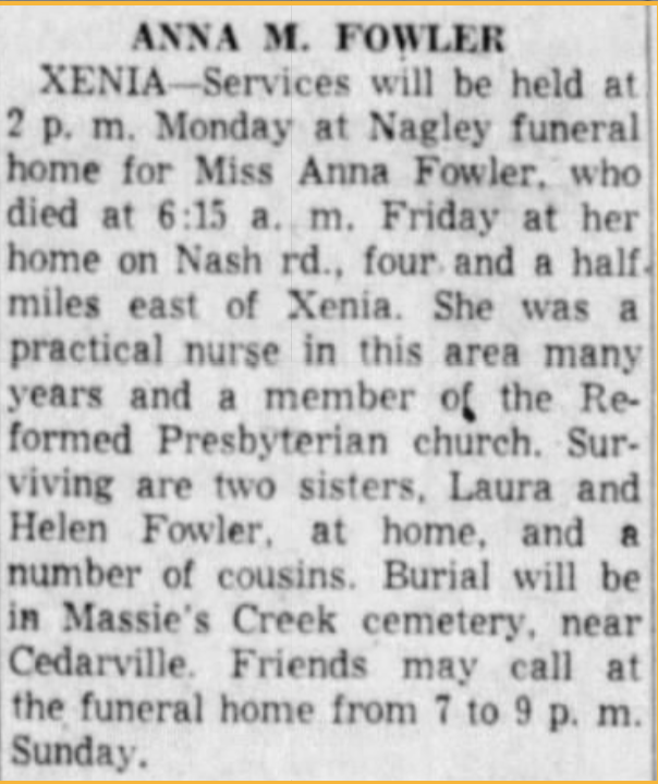 Like her siblings, Anna Fowler was a member of the Reformed Presbyterian Church, and she was laid to rest at Massies Creek Cemetery.