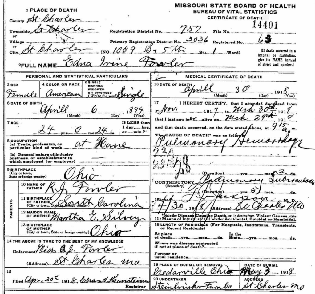 Edna Fowler was the last born child in the Richard Jefferson Fowler family. She was an aspiring pianist, and lived with her sister Jane Ethel Fowler in St Charles Missouri when she contracted tuberculosis. Edna Fowler died on April 30, 1918 less than a month after her twenty-fourth birthday, and her remains were sent back home to Cederville, Ohio.