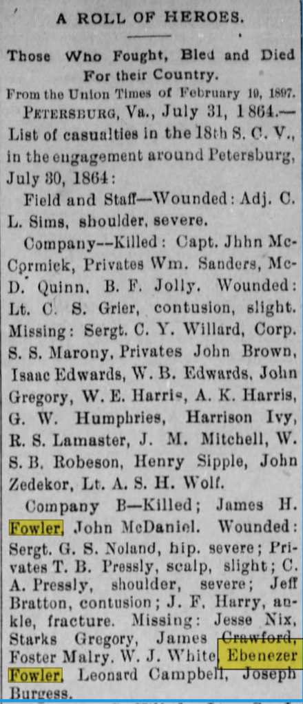 Ebenezer Fowler was one of the 403 missing or captured. He became a prisoner of war on July 30, 1864.