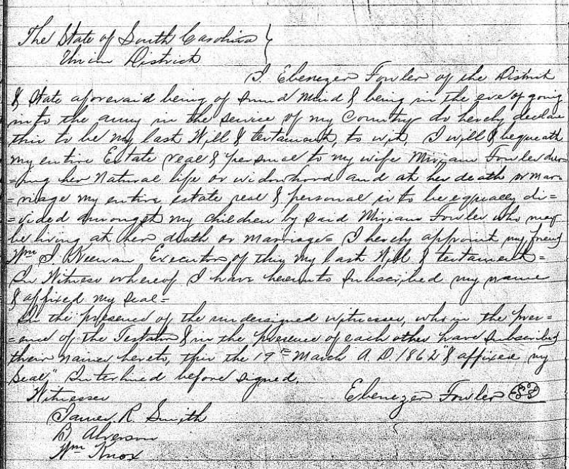 On March 19, 1862 — two days before his enlistment in Charleston —Ebenezer put pen to paper in the event that he should not return home from war.