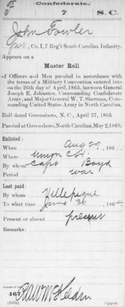 Twenty-five year old John Rube Fowler joined Captain C.W. Boyd’s 15th Regiment South Carolina Volunteers on August 29, 1861 at the Union Court House.