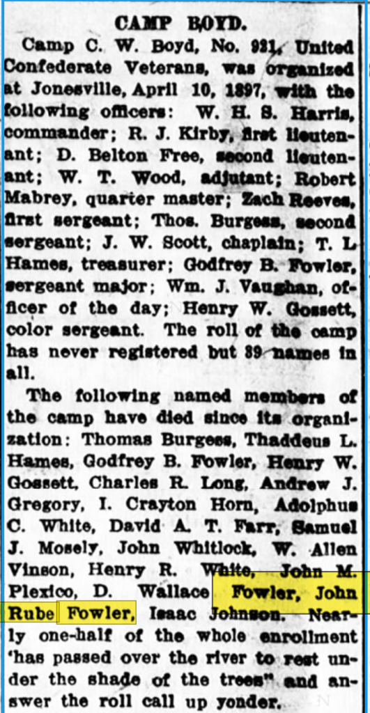 I can find no record of his death, but there was an article published in the Union Times on April 12, 1912 and it was stated that John Rube Fowler was one of the members of Captain Boyd’s Regiment that had “passed over the river to rest under the shade of the trees“