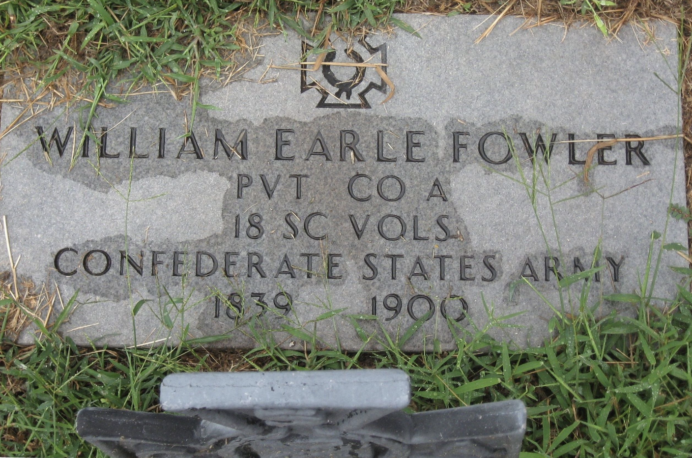 William Earle Fowler died August 1, 1898, and was buried at Goucher Baptist Church Cemetery in Cherokee County, South Carolina.