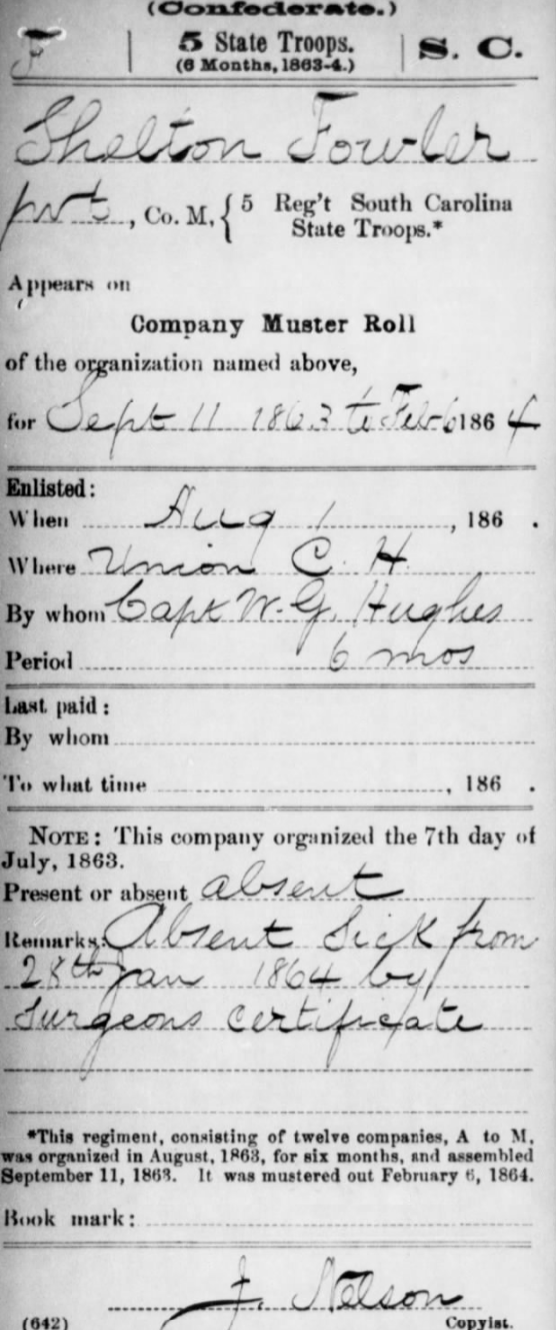 There are records for a Shelton Fowler who enlisted in both Captain Senn’s Company Post Guard on April 26, 1864 in Columbia, SC , and the Third Battalion Reserves, Company A Third State Troops on October 7, 1864 in Florence, SC.