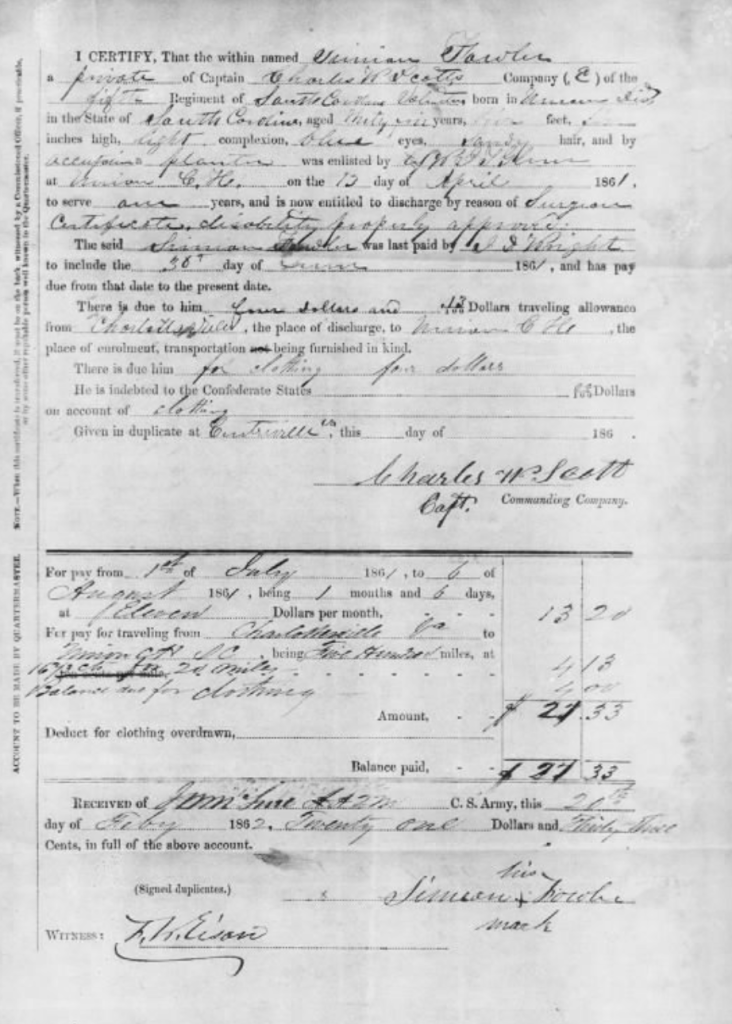 Less than a month later, Simeon Fowler was discharged from military service from a hospital in Charlottesville, Virginia. A surgeon had determined that he had a disability making him unfit for duty.