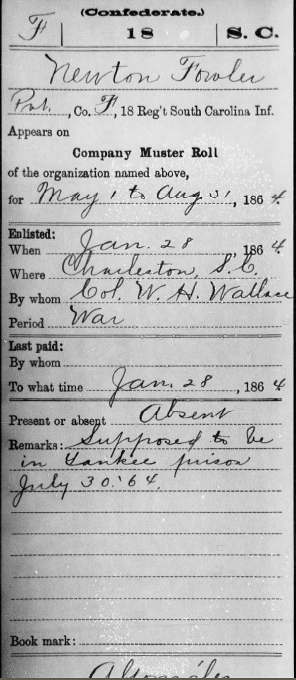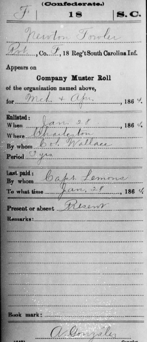Only seventeen or eighteen years old, Newton F. Fowler enlisted in Company F, 18th Regiment South Carolina Infantry on January 28, 1864 in Charleston, South Carolina. His brother John Fowler had enlisted in the same regiment and company three years before.