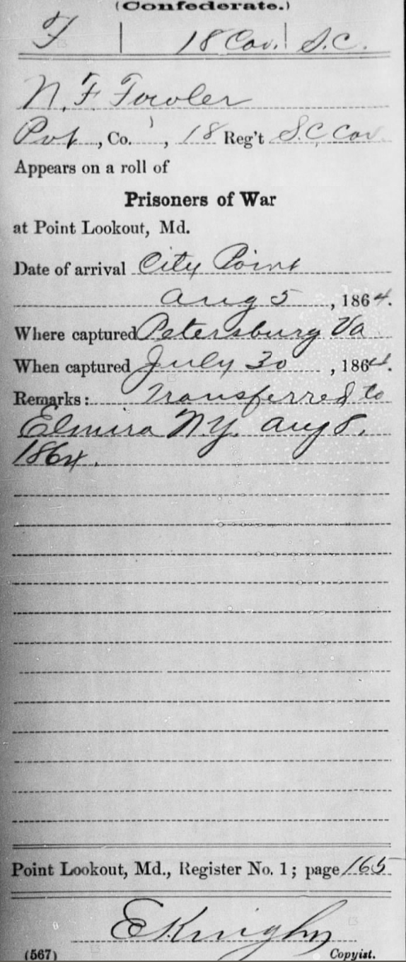 The Yankee army captured Newton Fowler on July 30, 1864 in Petersburg, Virginia. He was sent to Point Lookout, Maryland on August 5, then transferred to the Yankee Prisoner of War camp in Elmira, New York on August 8, 1864.