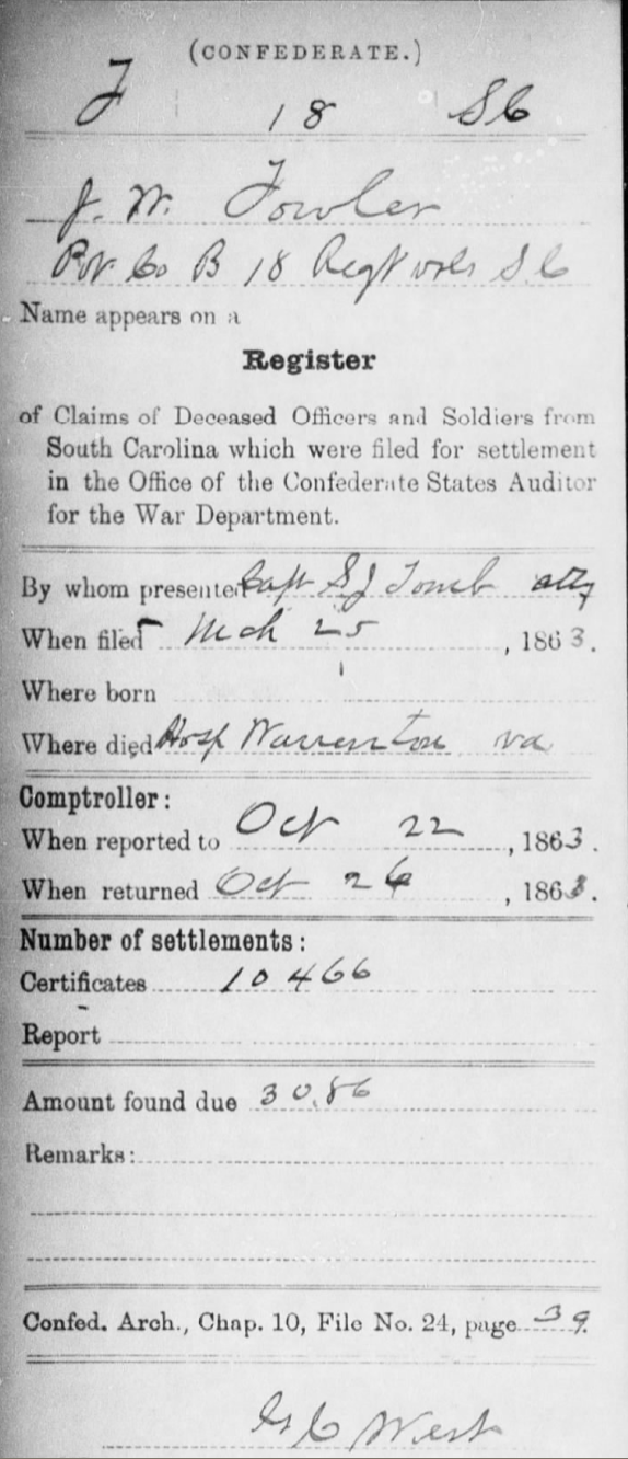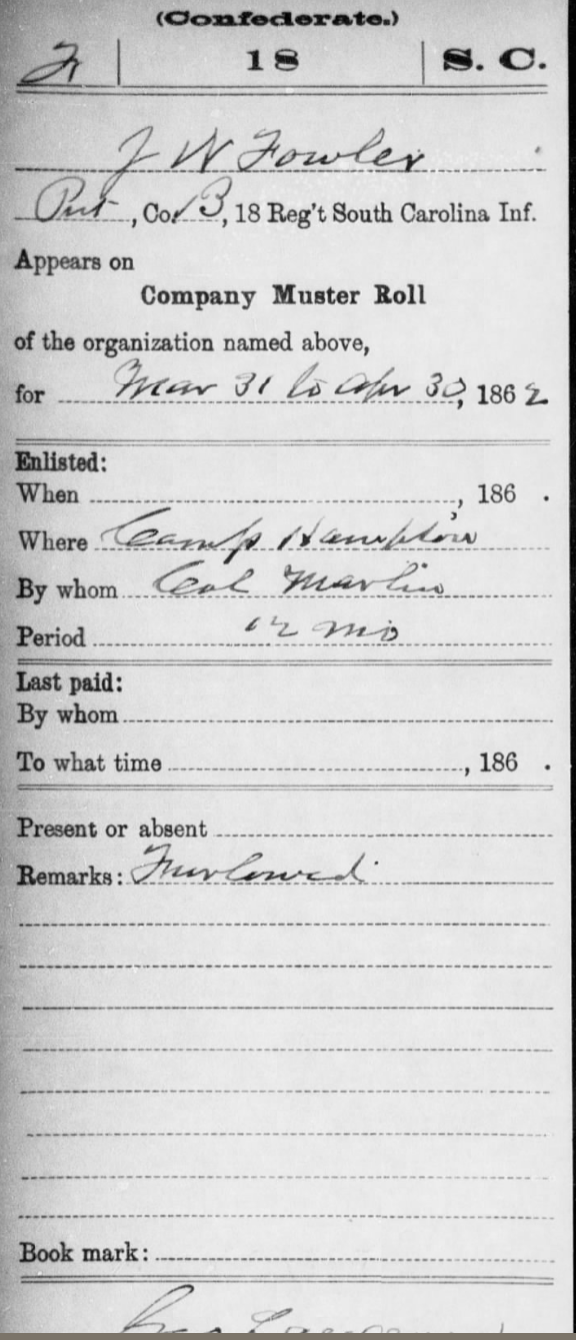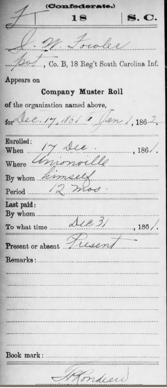 Once the Civil War commenced, James W. Fowler said farewell to his family and traveled to Unionville to enlist in Company B, 18th Regiment South Carolina Infantry. It was December 17, 1861, and he was thirty-one years old.