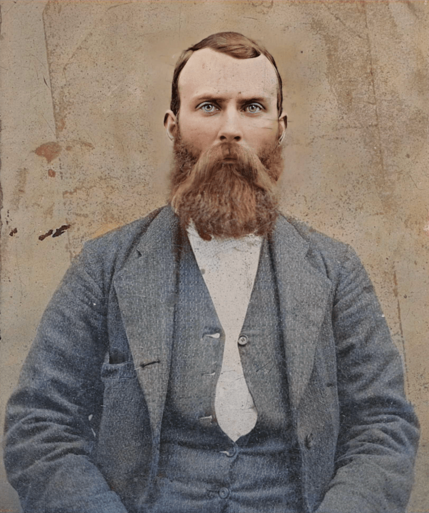 He had red hair, blue eyes, and a “high” complexion. He stood five feet, ten inches tall, and he was a farmer before he became a soldier in the Confederate Army.
