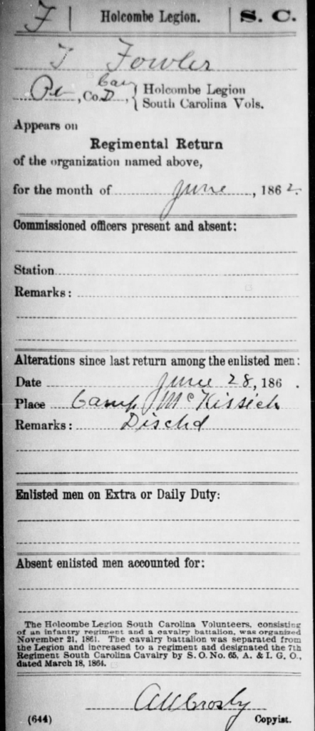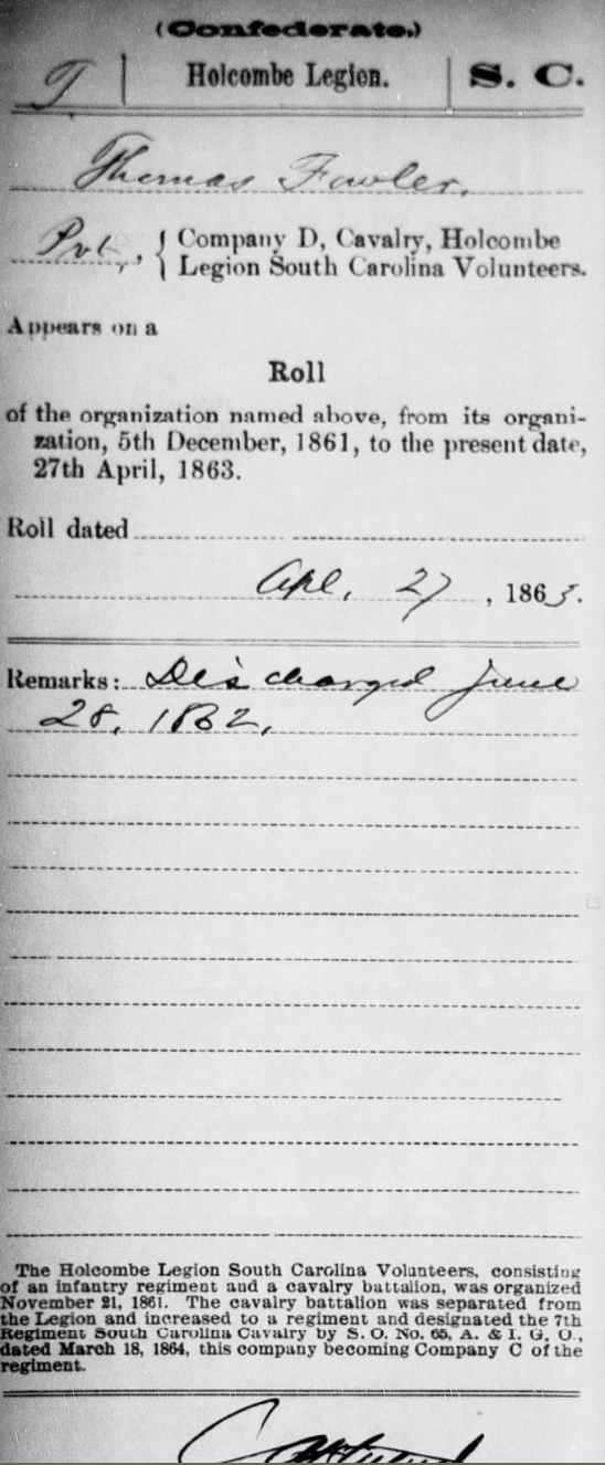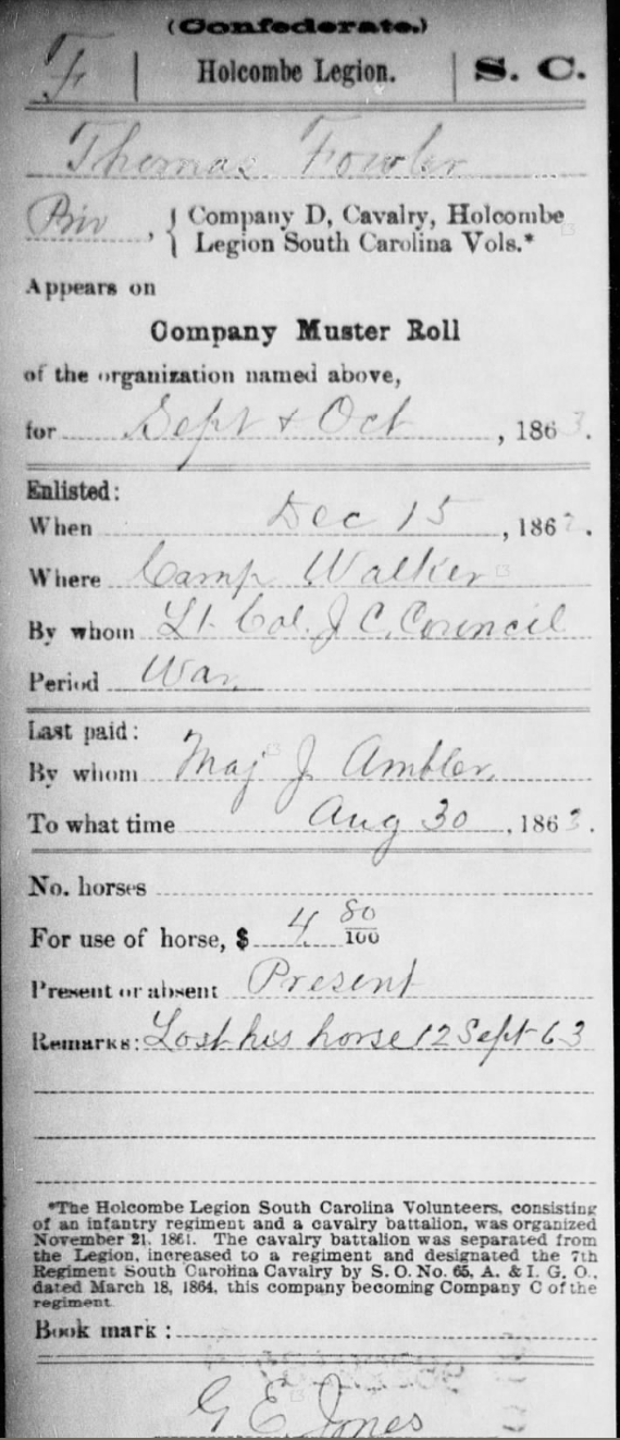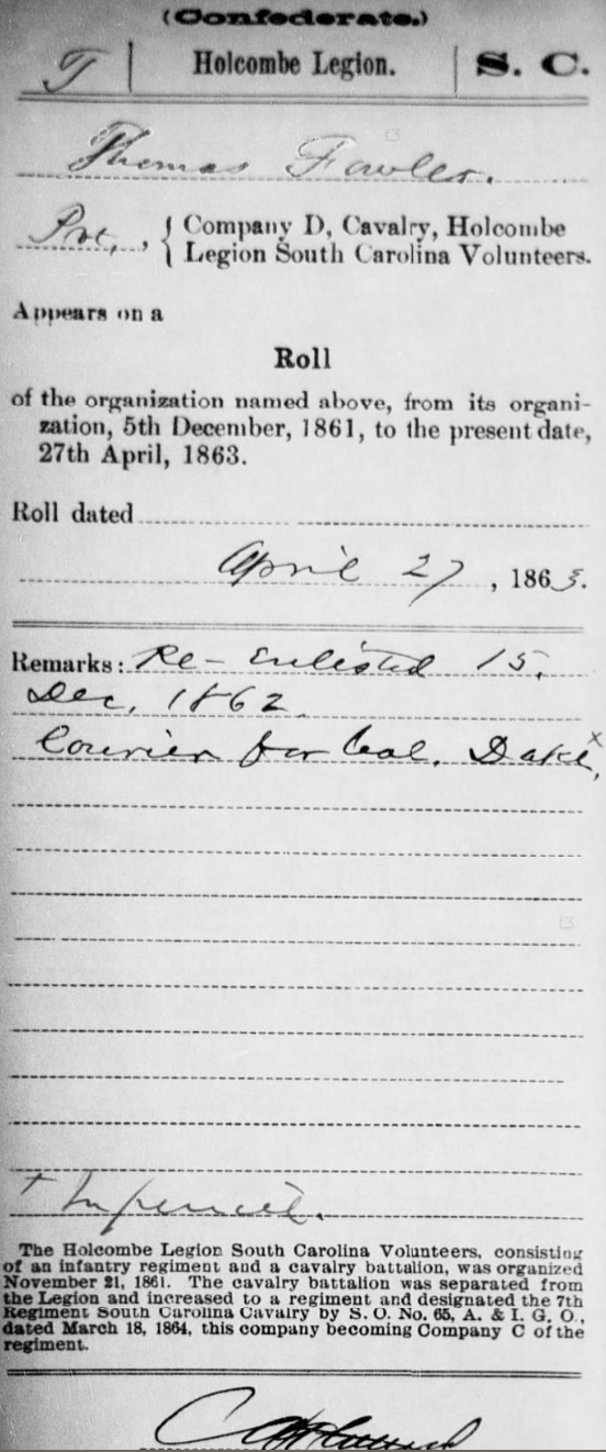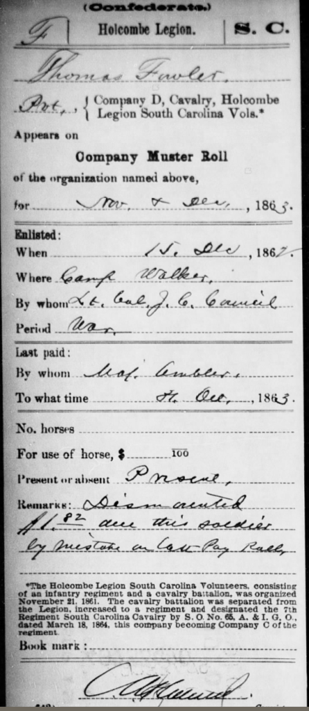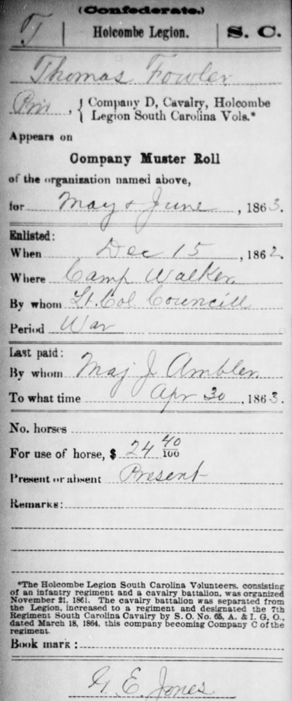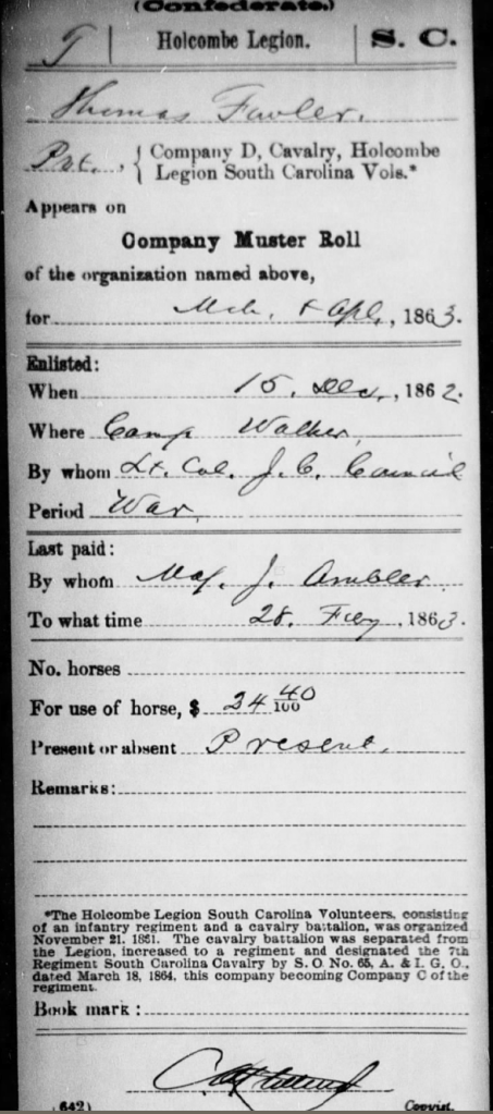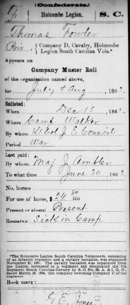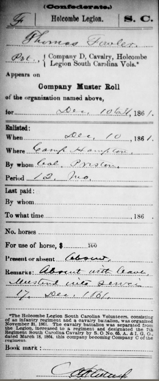 Thomas Fowler joined the Confederate army after the Civil War commenced. He was accompanied by his Fowler cousins and many of his neighbors. He enlisted in Company D 7th Cavalry Holcombe’s Legion on the 10th of December, 1861 at Camp Hampton. He was mustered into military service on December 17th.