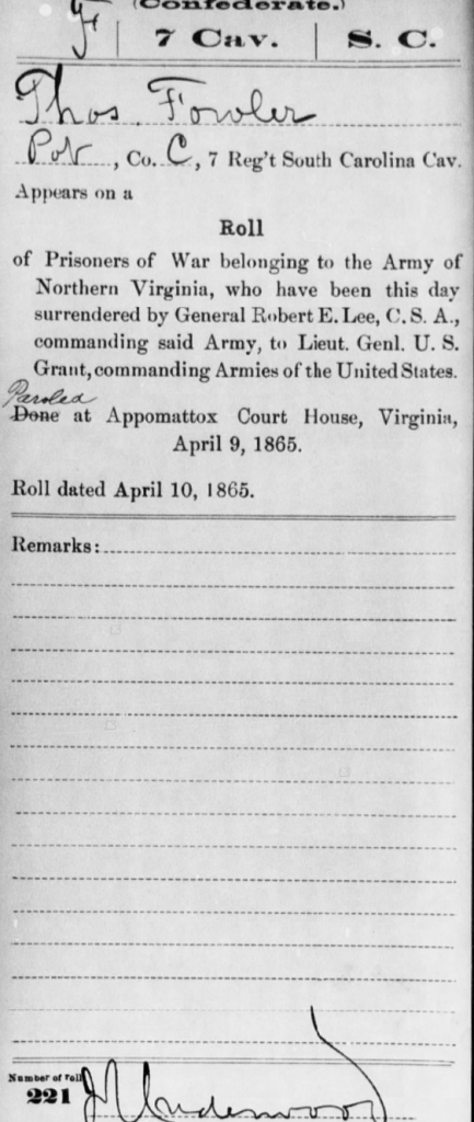 The two men had enlisted in Company B, 7th Regiment SC Calvary in December 1861. He stated that Thomas Fowler was at the Surrender at Appomattox, Virginia. Calvin Whitlock had been wounded on April 5, 1861 and although he was nearby, he was not at the surrender.