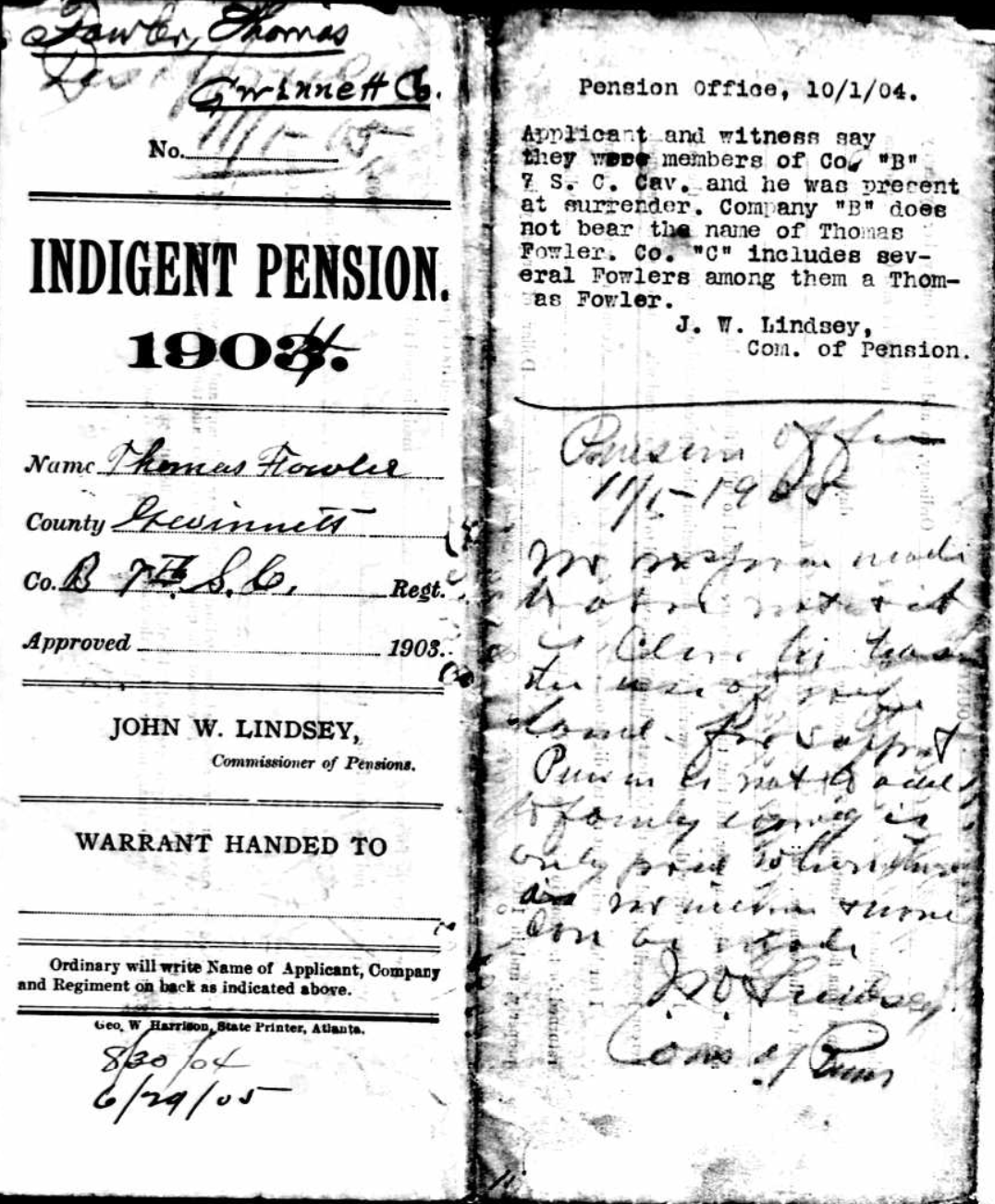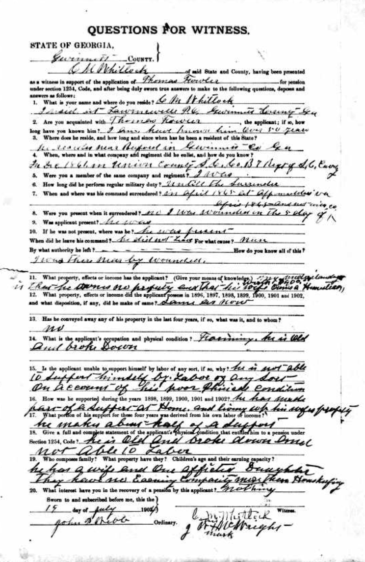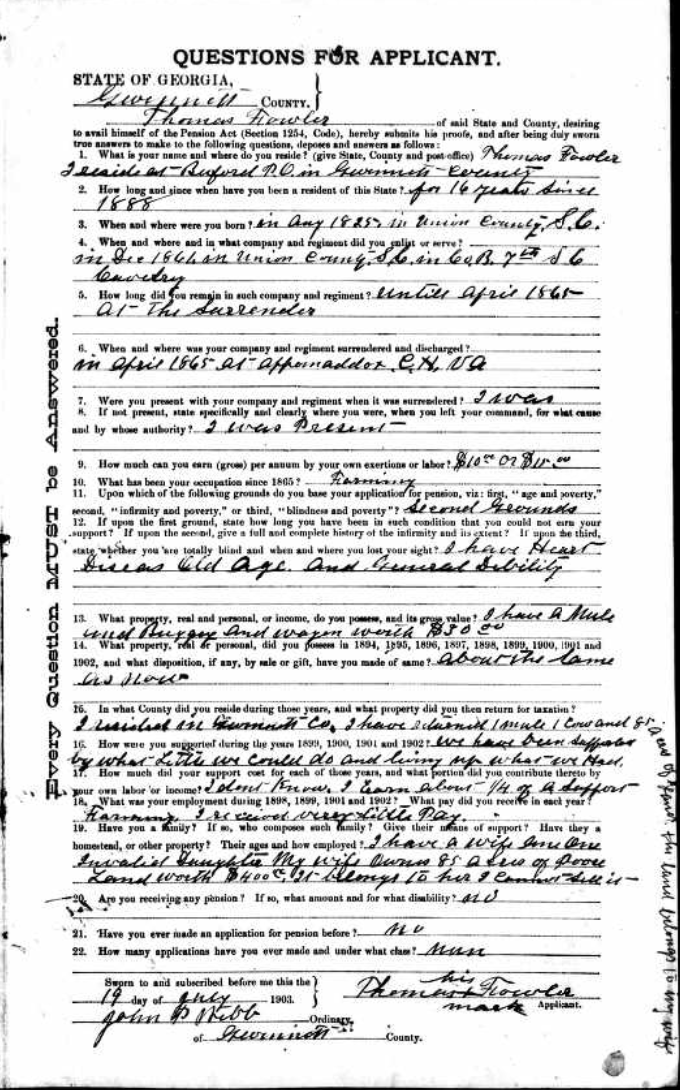 While living in Gwinnett County, Georgia, he applied for his service in the South Carolina 7th Cavalry during the Civil War. Both Thomas Fowler and his witness, Calvin M. Whitlock, mistakenly stated they were in “Company B” of the 7th Cavalry.