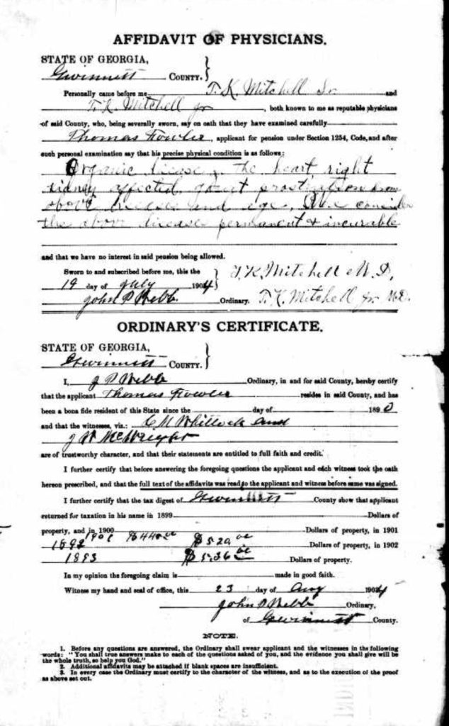 Thomas Fowler, his wife and daughter Anna moved to Sugar Hill (near Buford), Gwinnett County, Georgia in 1888. It was here that I found and joined the military with the man, for Thomas Fowler applied for an Indigent Pension in 1904.